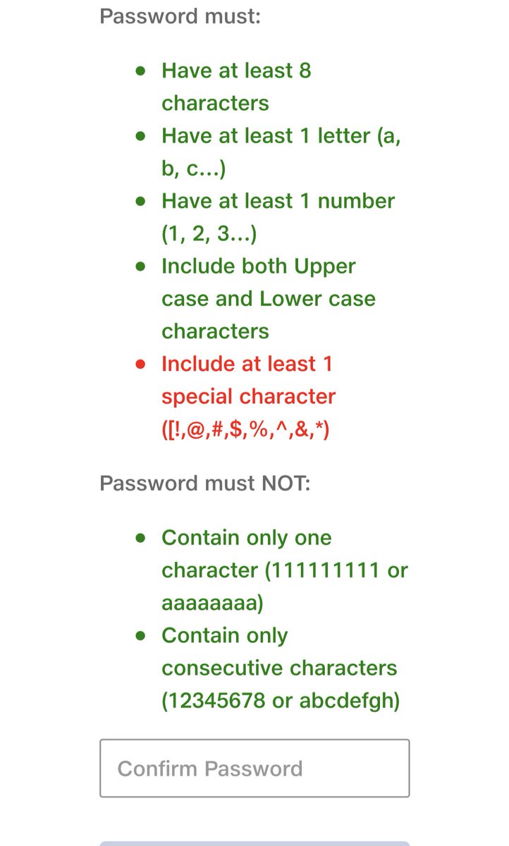 G00dm0rn!ng is more than six characters long, has 2 capital letters, 3 numbers,and 1 special symbol characters, so it would be do you have some sort of a question? Minimum and maximum character length validation using asp.net regularexpression validators. Provide details and share your research! I expect the problem is related to the unenforced standard, but i'm not certain. Include at least one screenshot. They should not be the name of a pet or child. Why i got the error : I changed the password back to the above. .passwords include at least one uppercase letter, one lowercase letter, one digit, and one special character? At least 1 special character. I created a password with upper, lower case characters, numbers, and special characters. Keep the sites in alphabetical order. Exceptions to this rule include watermarks serving to credit the original author, and blurring/boxing out of personal information.
